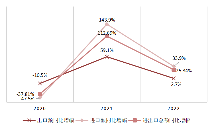 海关总署的数据显示,2022年我国珠宝行业进出口总额为1,338亿美元,同比增长25.3%。其中,出口总额为301亿美元,同比增长2.7%;进口总额为1,037亿美元,同比增幅为33.9%。可以看出,我国珠宝行业的进出口在2021年实现由负转正且高增长的基础上,2022年依旧保持着进出两旺的强劲势头,这表明我国珠宝行业在国际供应链上的优势和地位依旧比较牢固。